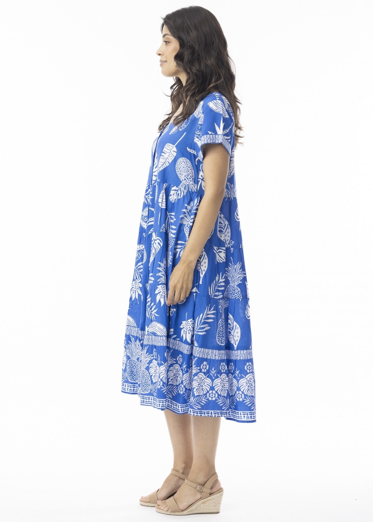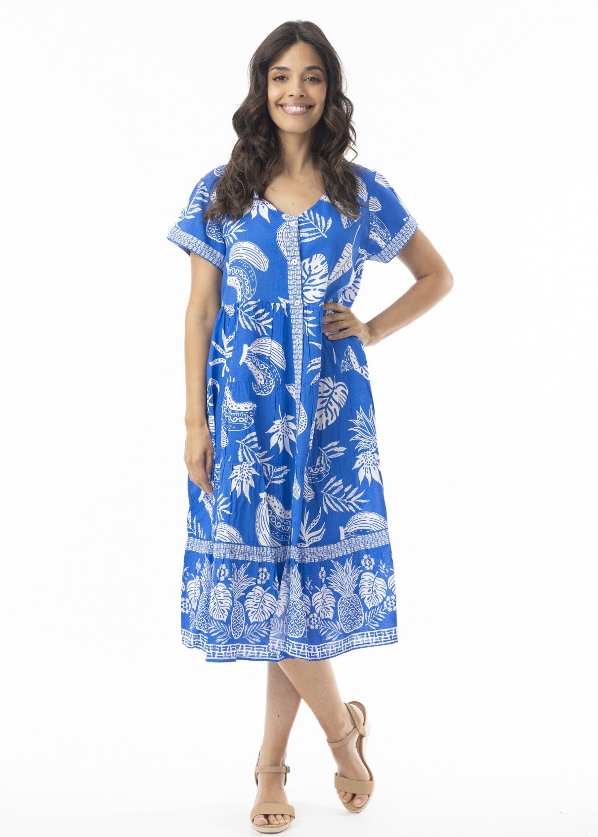 Brighten up your summer wardrobe with this casual print dress. A flattering v-neckline, buttons at the bust, cap sleeves, and pleats at the waist that fall into a knee-length skirt makes this piece is perfect as your new go-to summer dress!