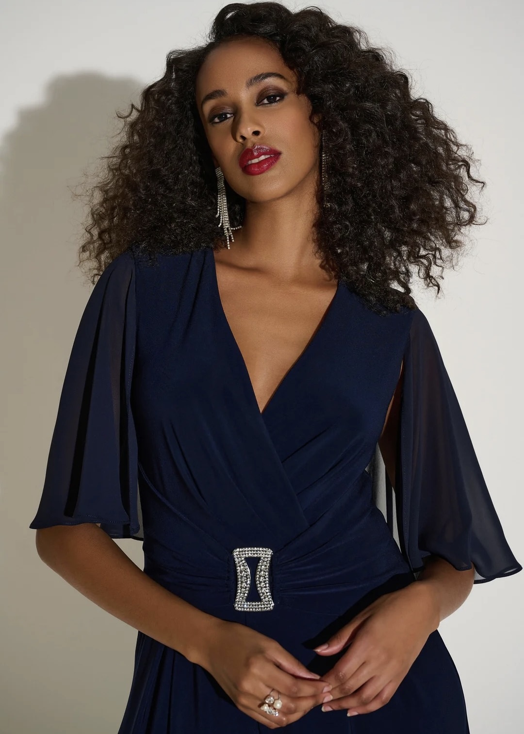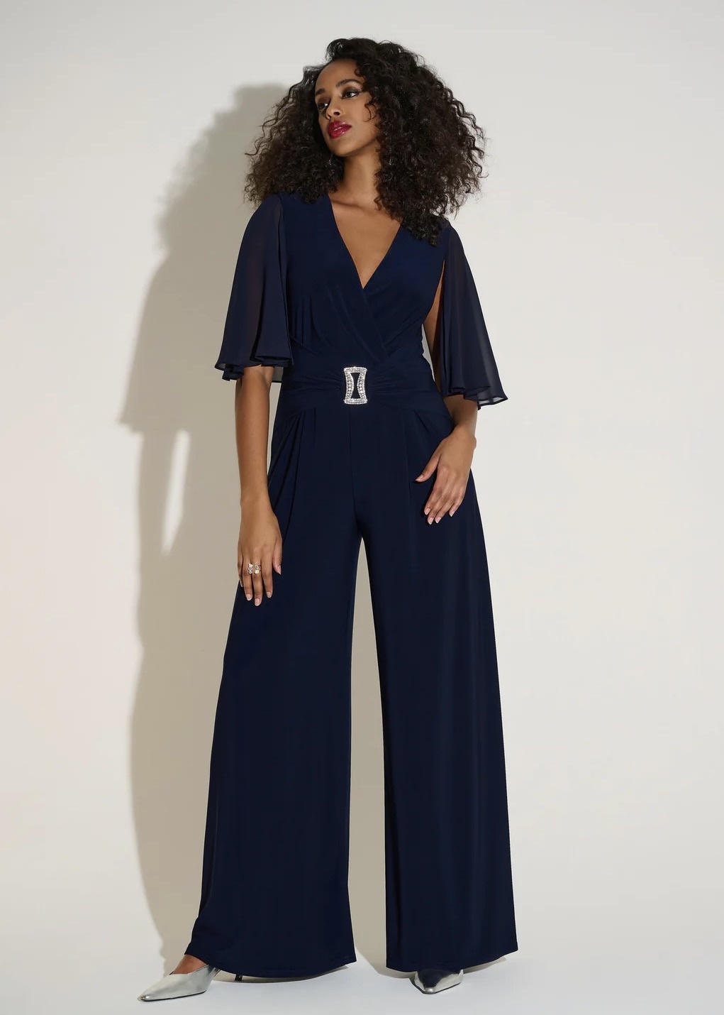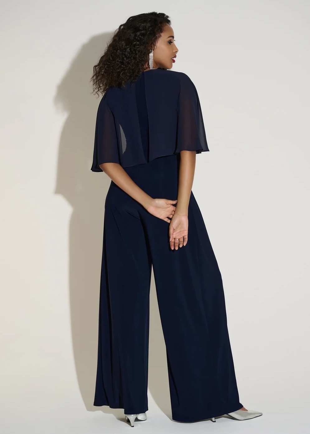 Gracefully refined jumpsuit combines silky knit and chiffon for a sophistication. A wrap neckline and waist tie with sparkling rhinestone detail defines the silhouette. The chiffon cape drapes elegantly over the shoulders and wide leg pant adds elegance.