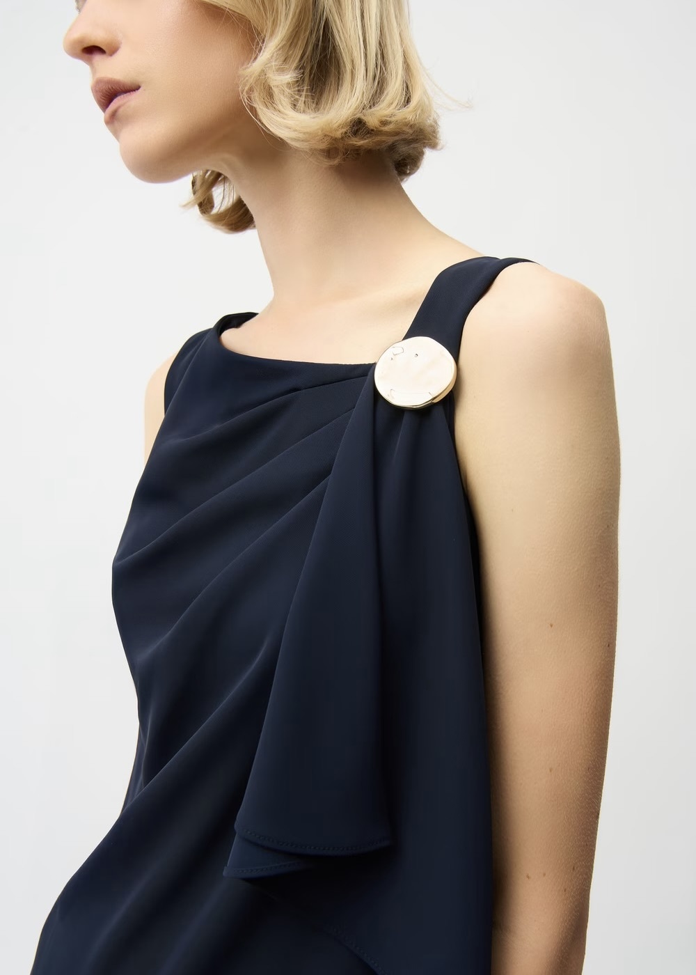 The epitome of elegance and sophistication. This stunning piece features a boat-neck design and a sleeveless, flutter-sleeve combination that adds a feminine touch. Perfect for formal and semi-formal occasions.