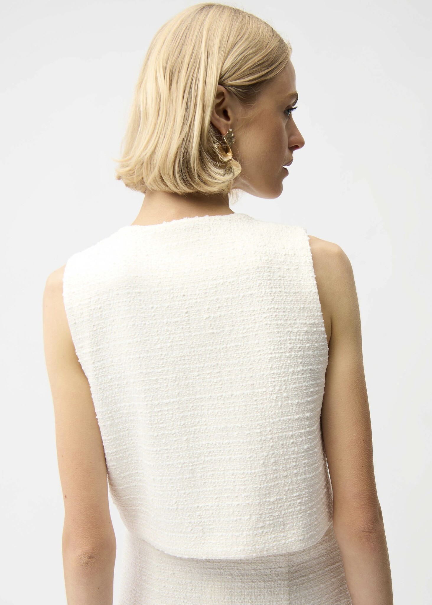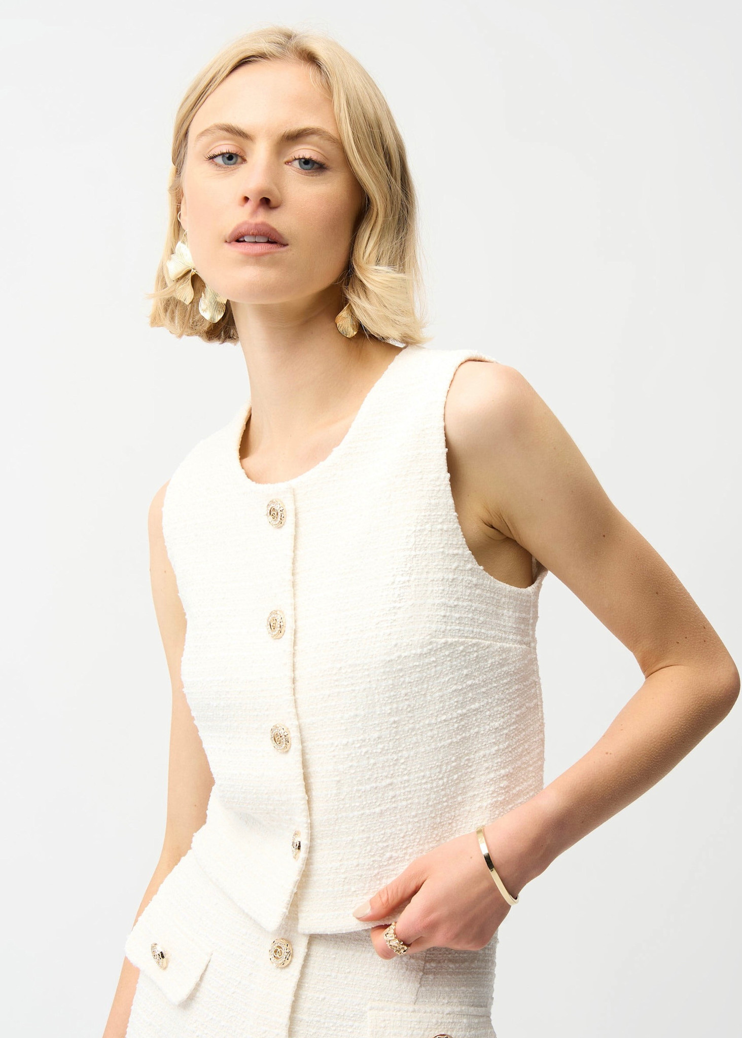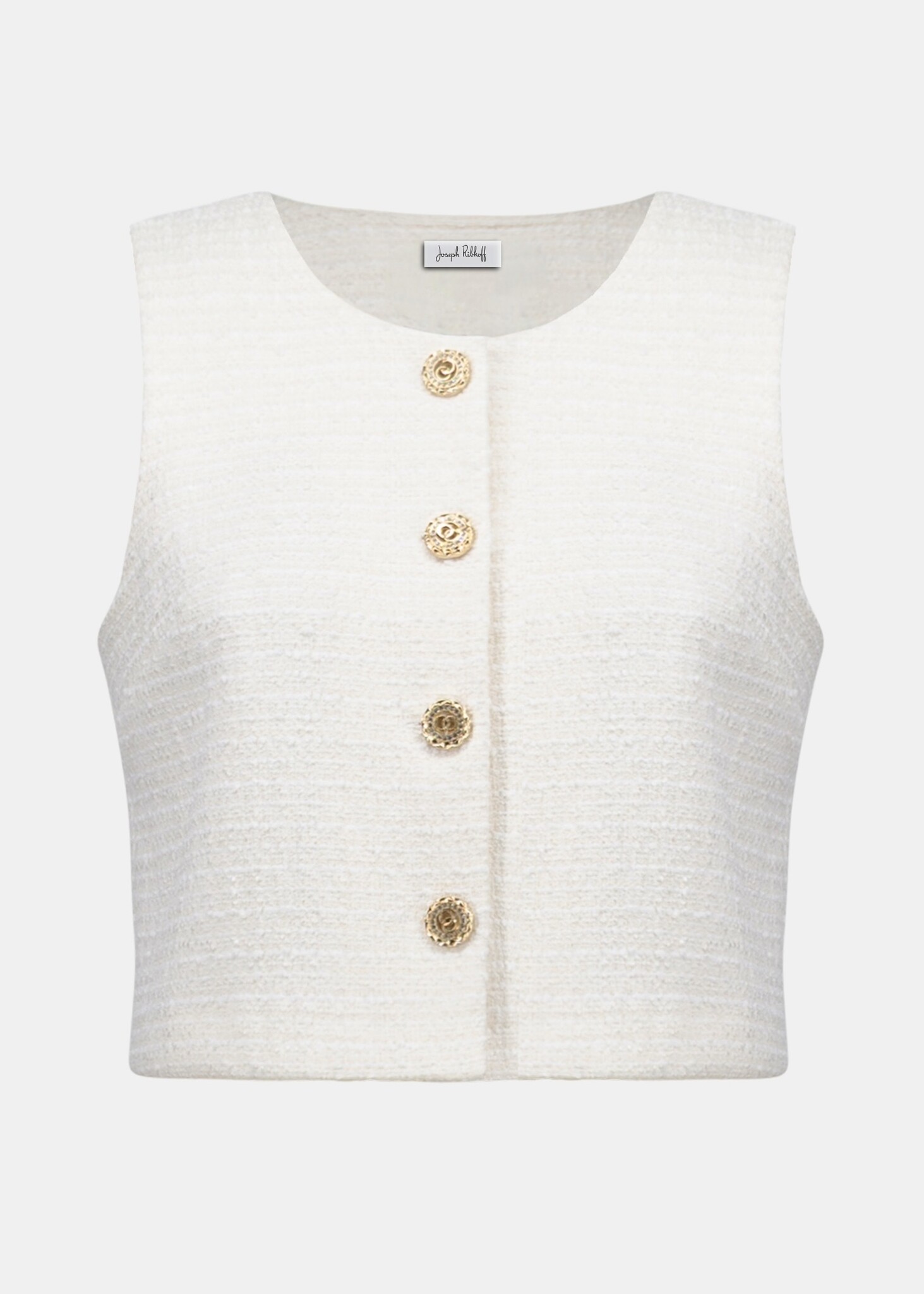 Designed with clean lines and tactile texture, this bouclé vest features a scoop neckline and a sleeveless cut. Gold buttons at the front add a refined, standout finish.