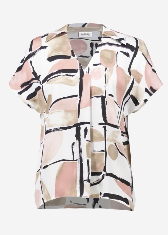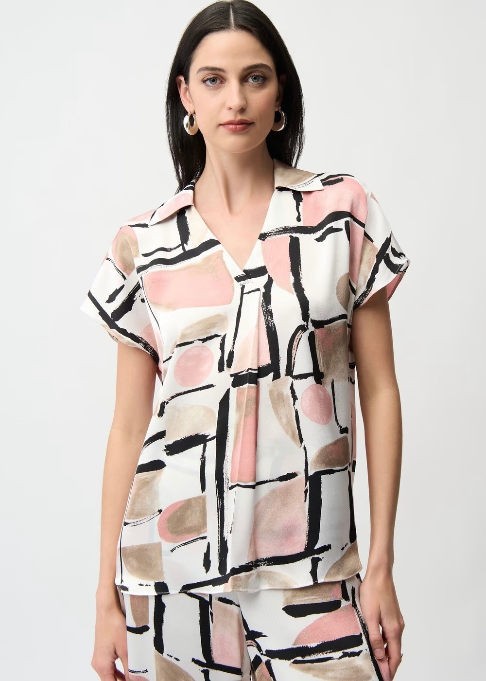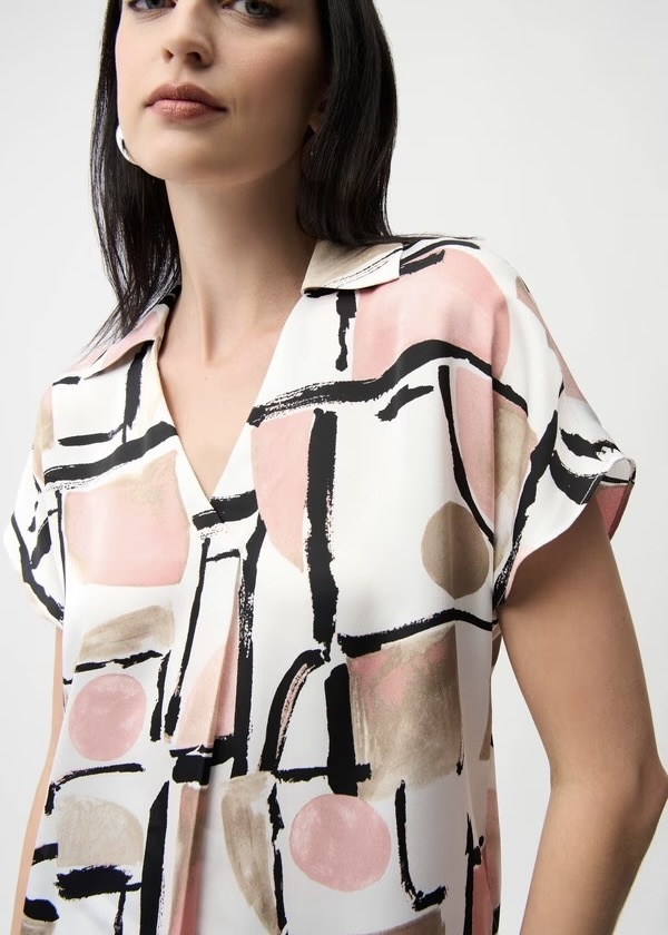 This hip-length, relaxed fit top features a stylish v-neck and abstract pattern that adds flair to any outfit. With its button closure and straight short-sleeves, it offers both comfort and sophistication.