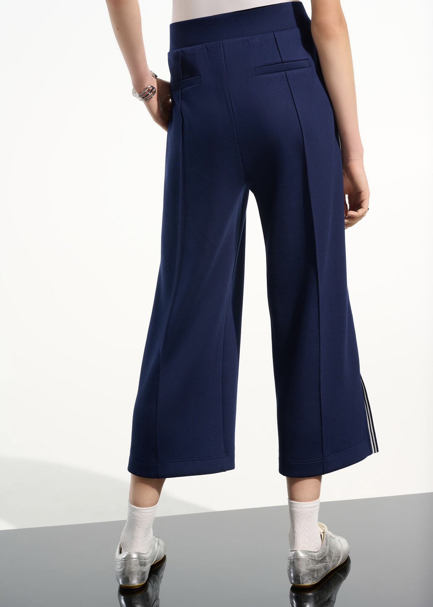 A sporty twist on a soft culotte shape, these scuba jersey pants feature side stripe rib trim and clean welt-style details. The elastic waistband with gentle shirring keeps the fit relaxed yet refined.