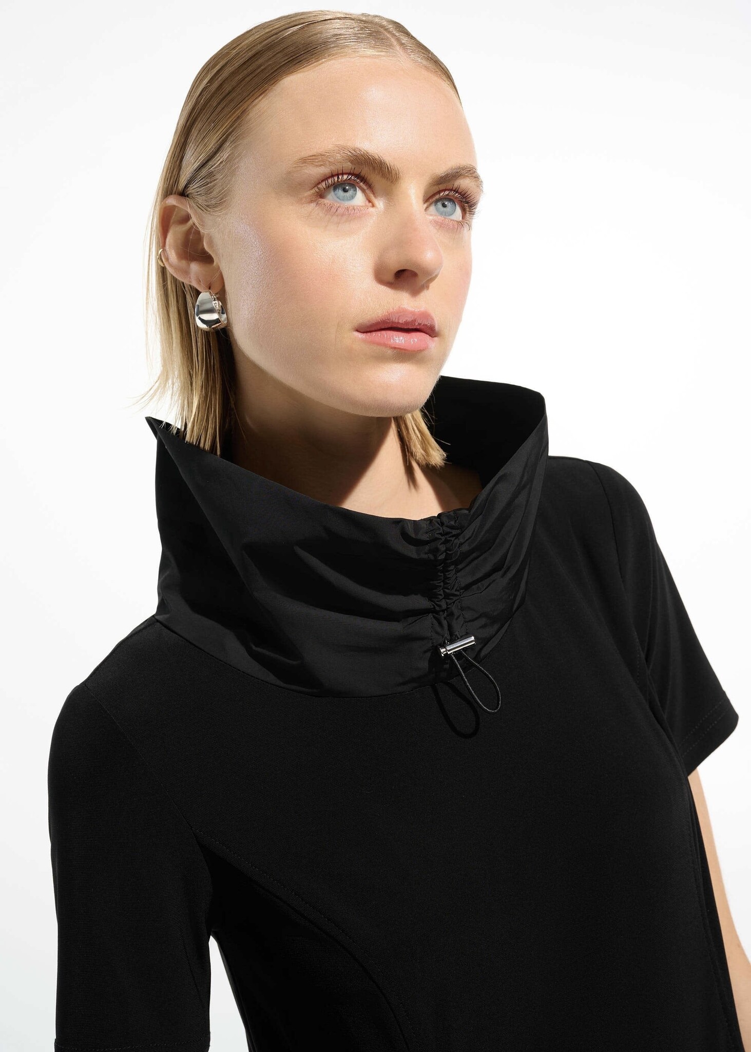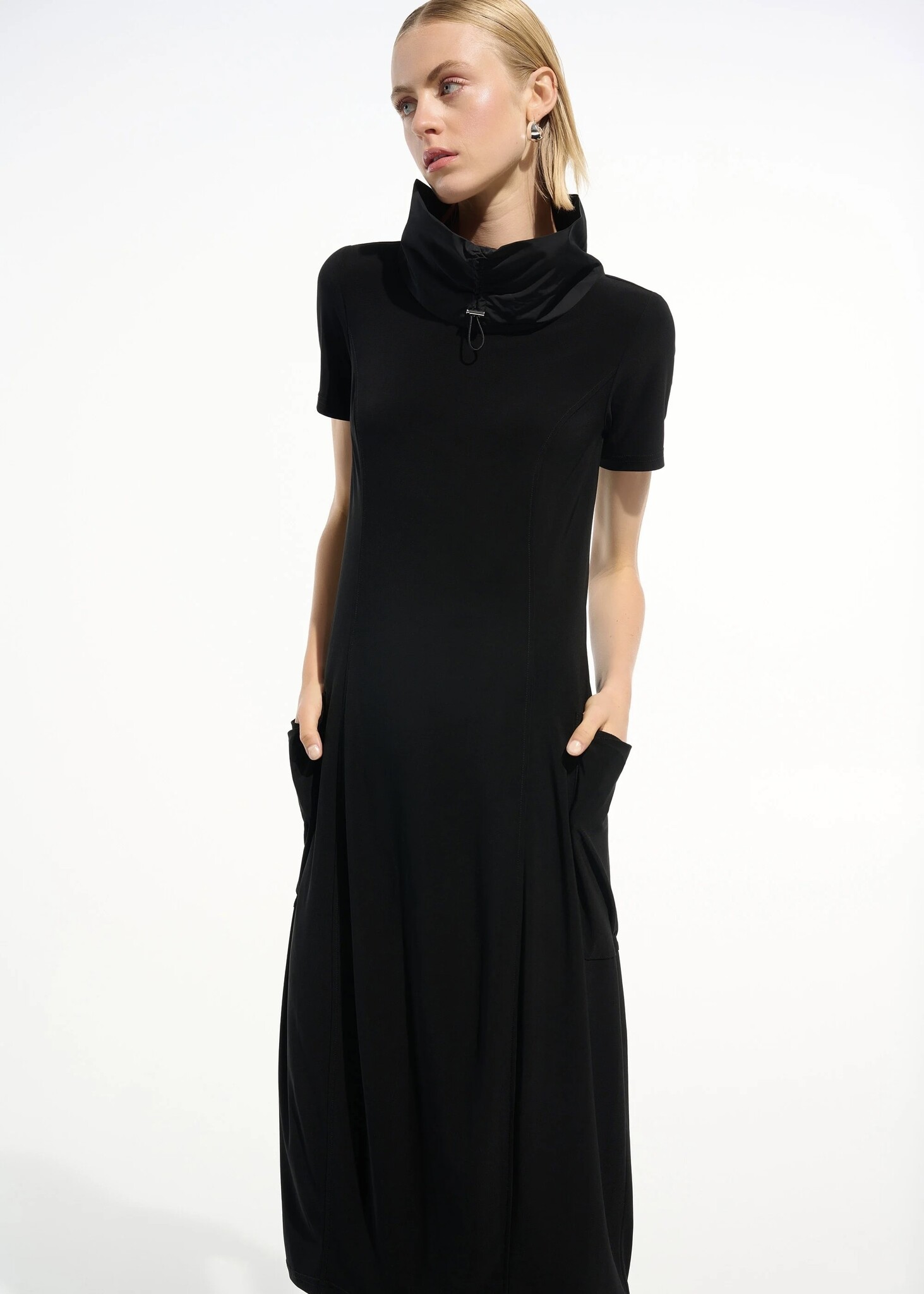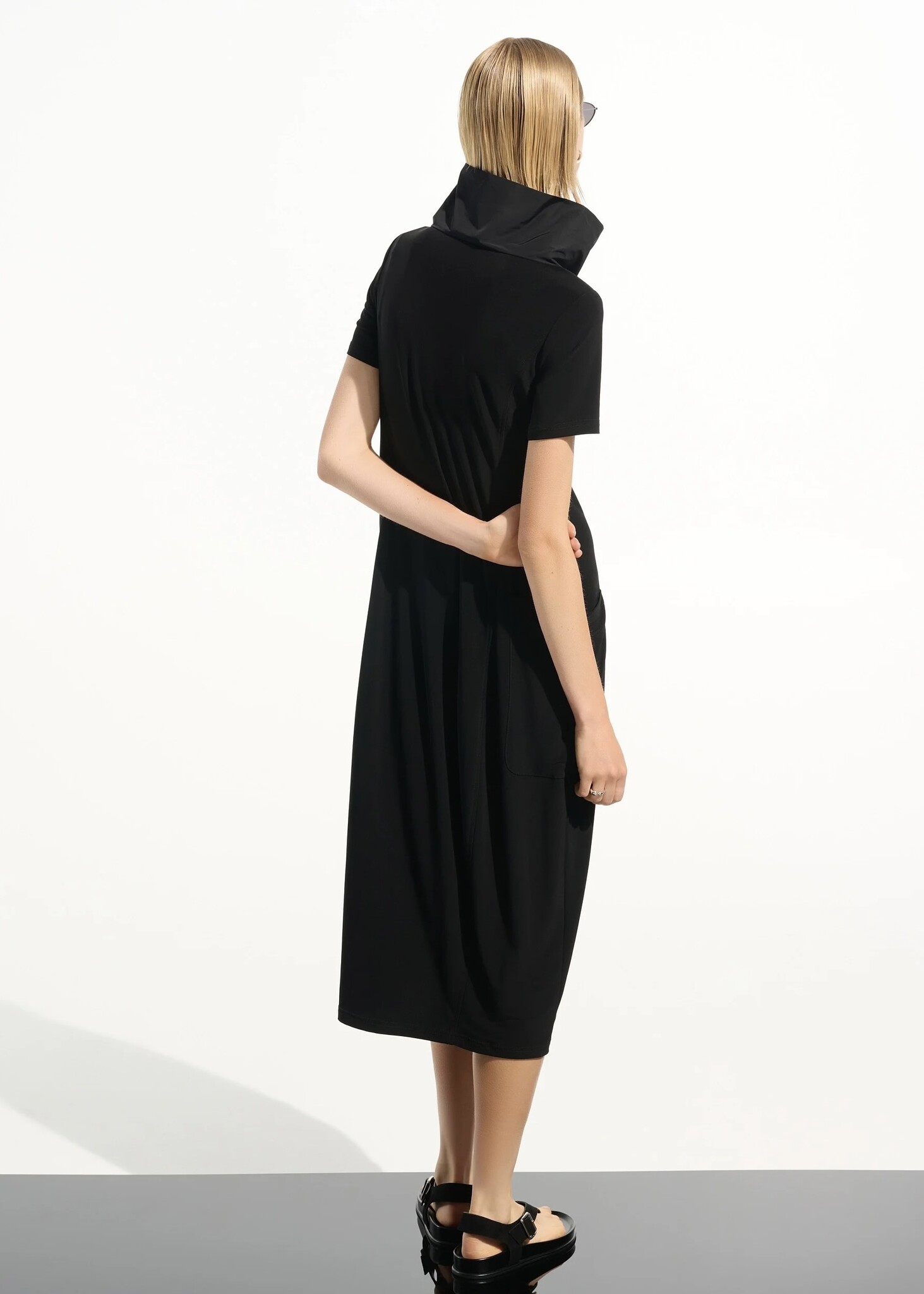 A sporty twist on a cocoon classic. This silky knit dress features a structured memory funnel collar with drawstring detail, balanced by soft gathers and a relaxed fit that falls just below the knee.