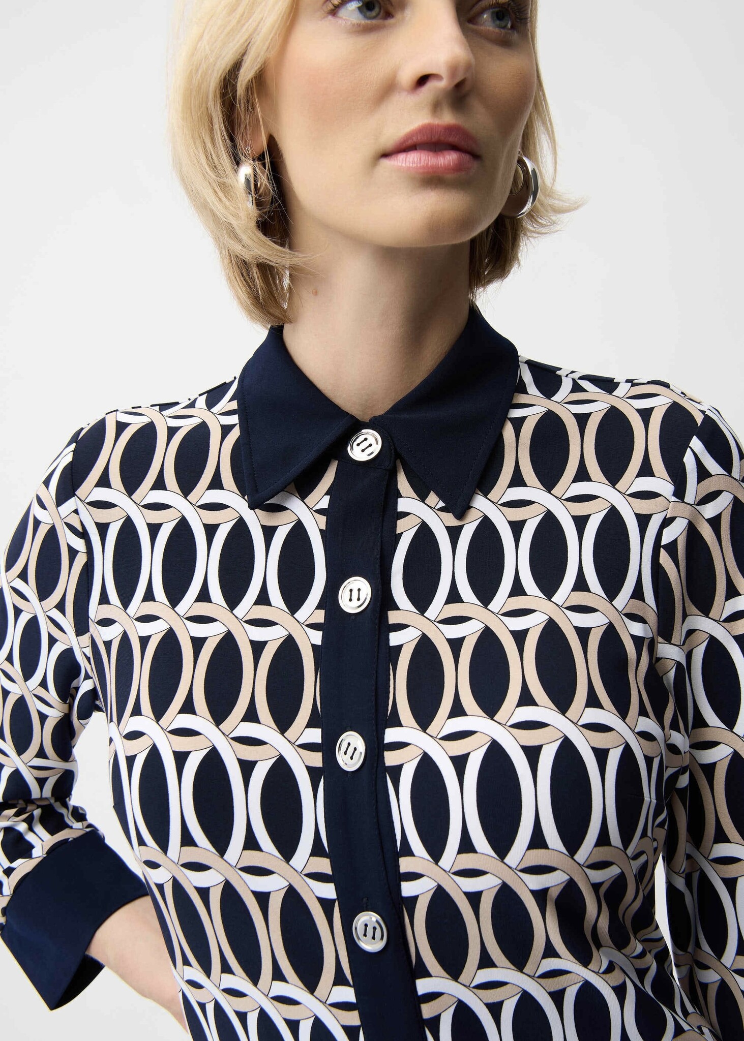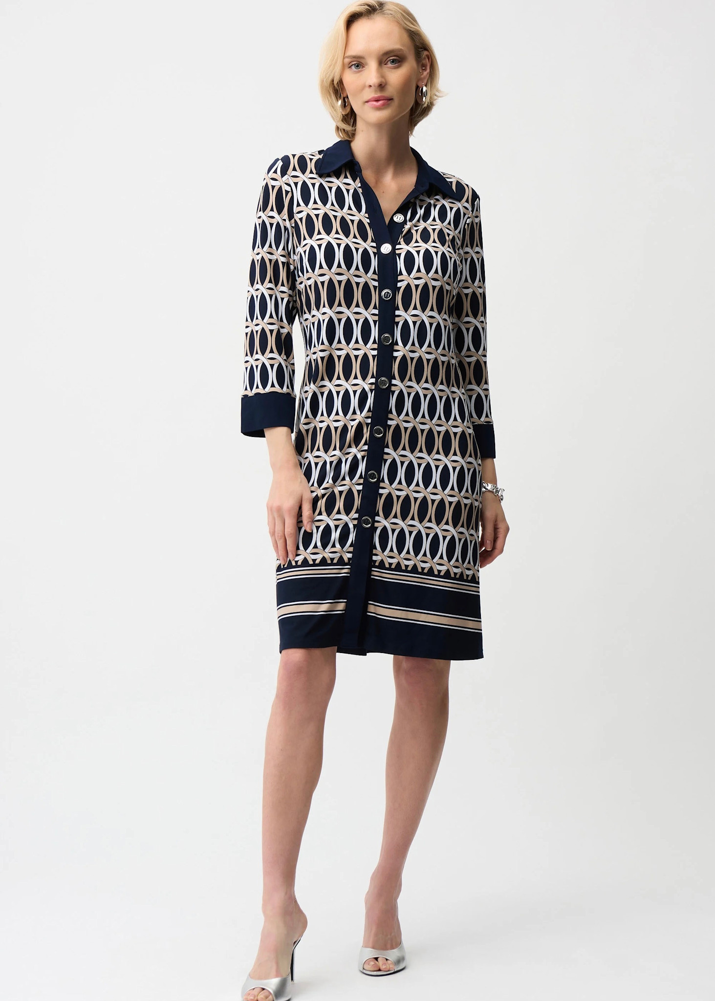 A stunning geometric print elevates this silky knit A-line shirt dress. Featuring a classic shirt collar, front placket with buttons, and three-quarter sleeves with cuff borders, it offers effortless sophistication with a tailored yet relaxed fit.