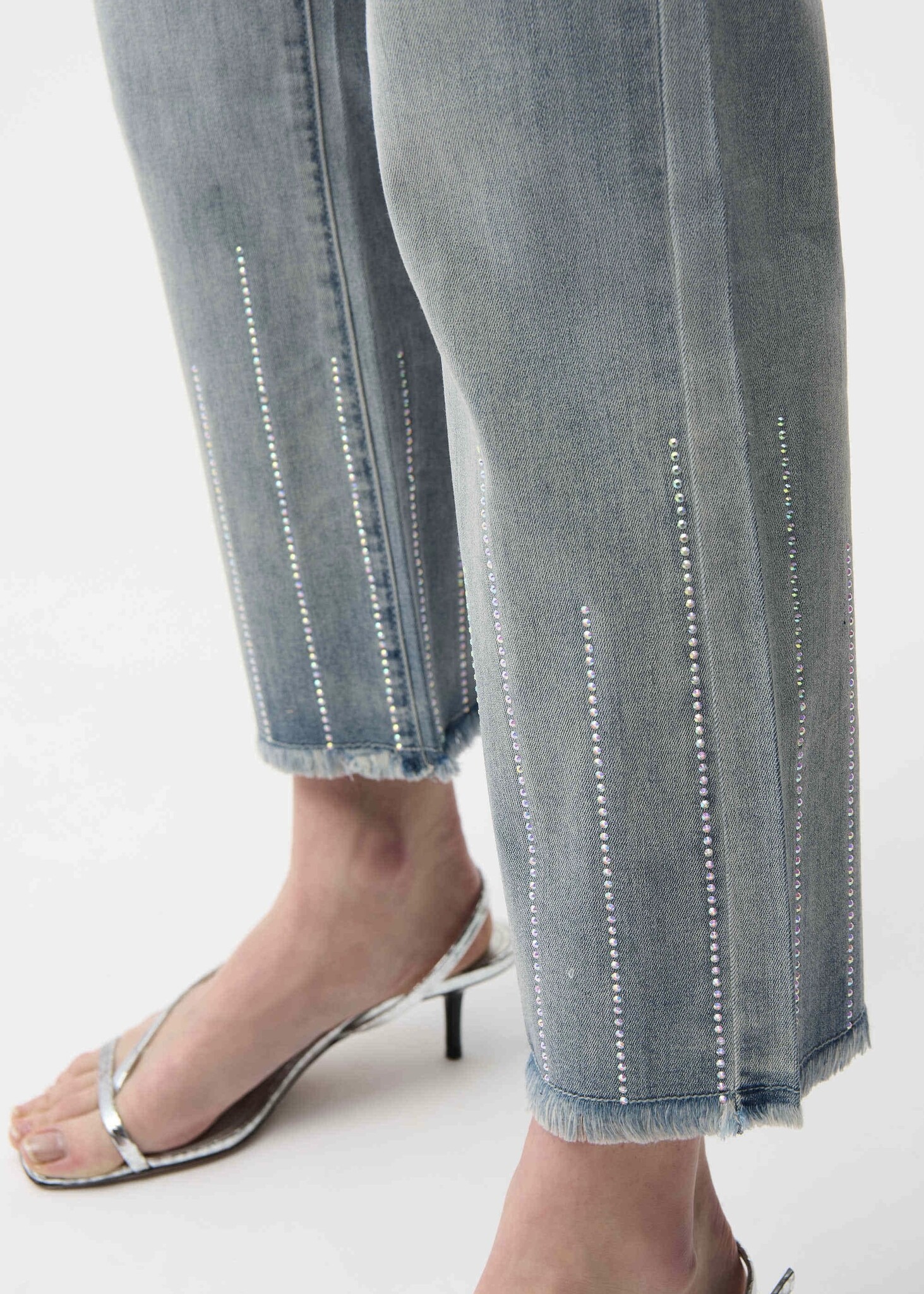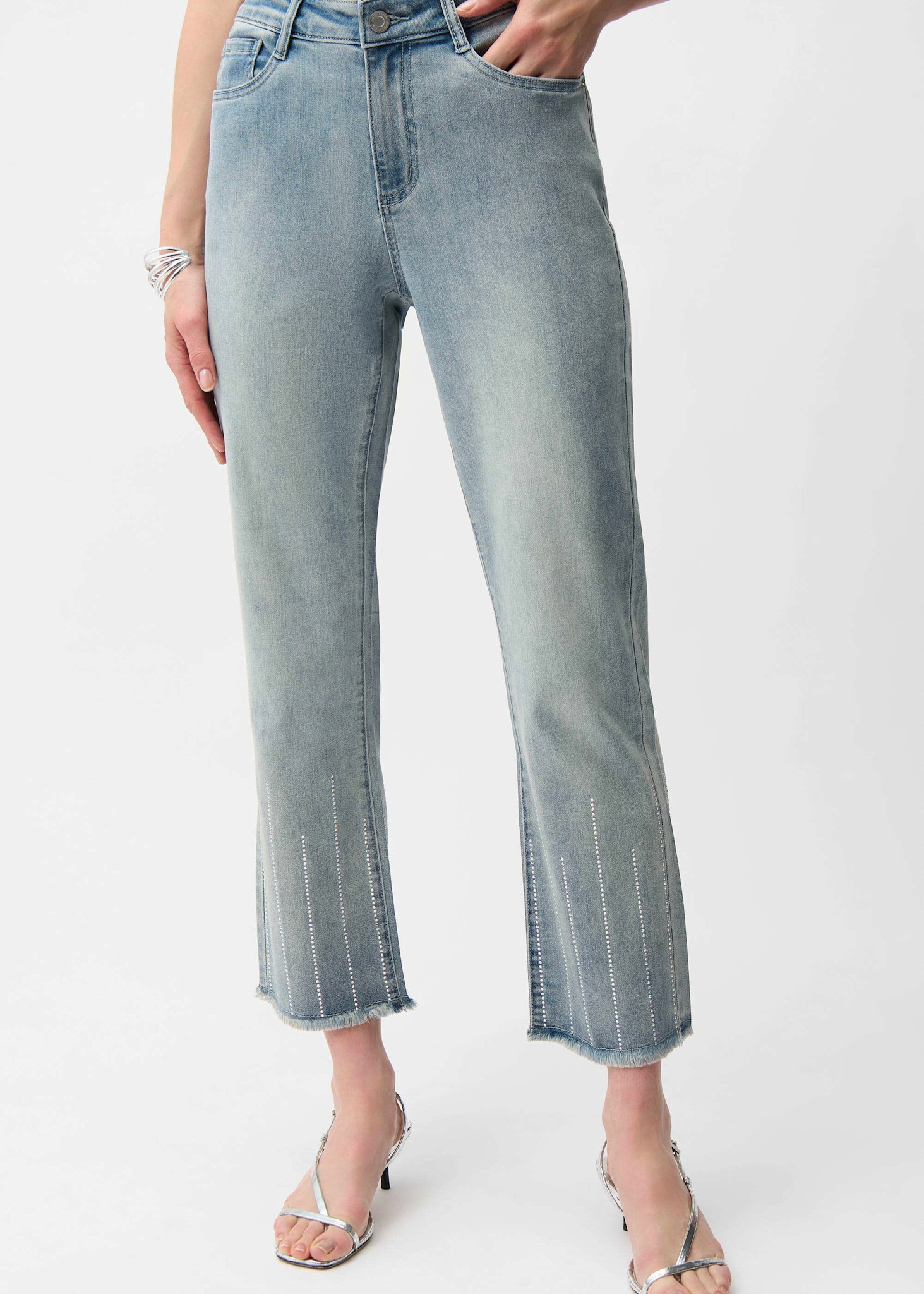 These Joseph Ribkoff FEATHERWEAVE™ denim crop pants feature a straight-leg silhouette, frayed hems, and heat-transfer rhinestones for subtle shine. Joseph Ribkoff FEATHERWEAVE™, made from a lightweight modal blend, super soft-to-touch stretch fabric.