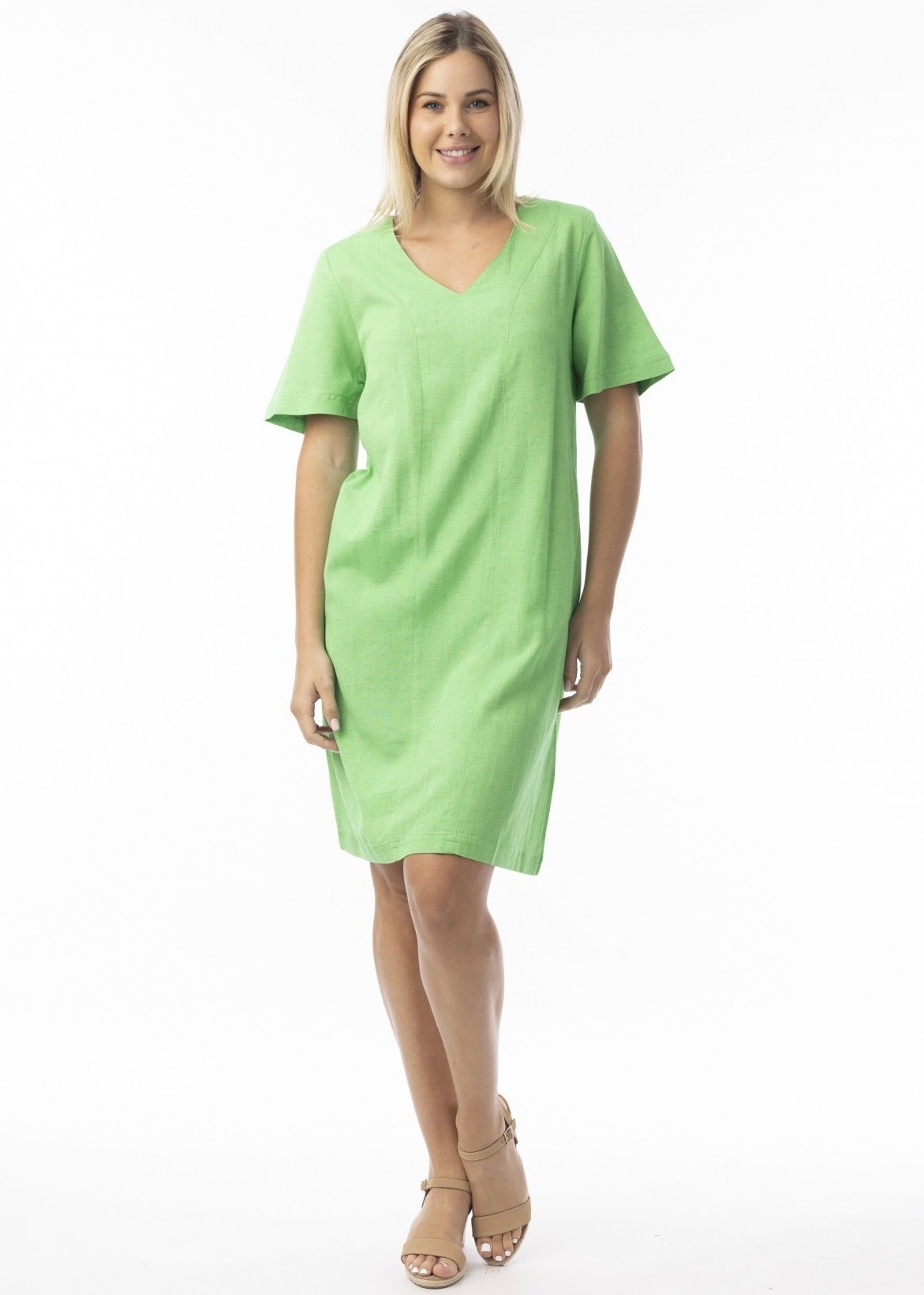 Meet your new warm-weather essential. Designed with loose short sleeves, a flattering wide V-neckline, and practical side pockets, this breezy dress is crafted from breathable linen for effortless comfort and timeless style.