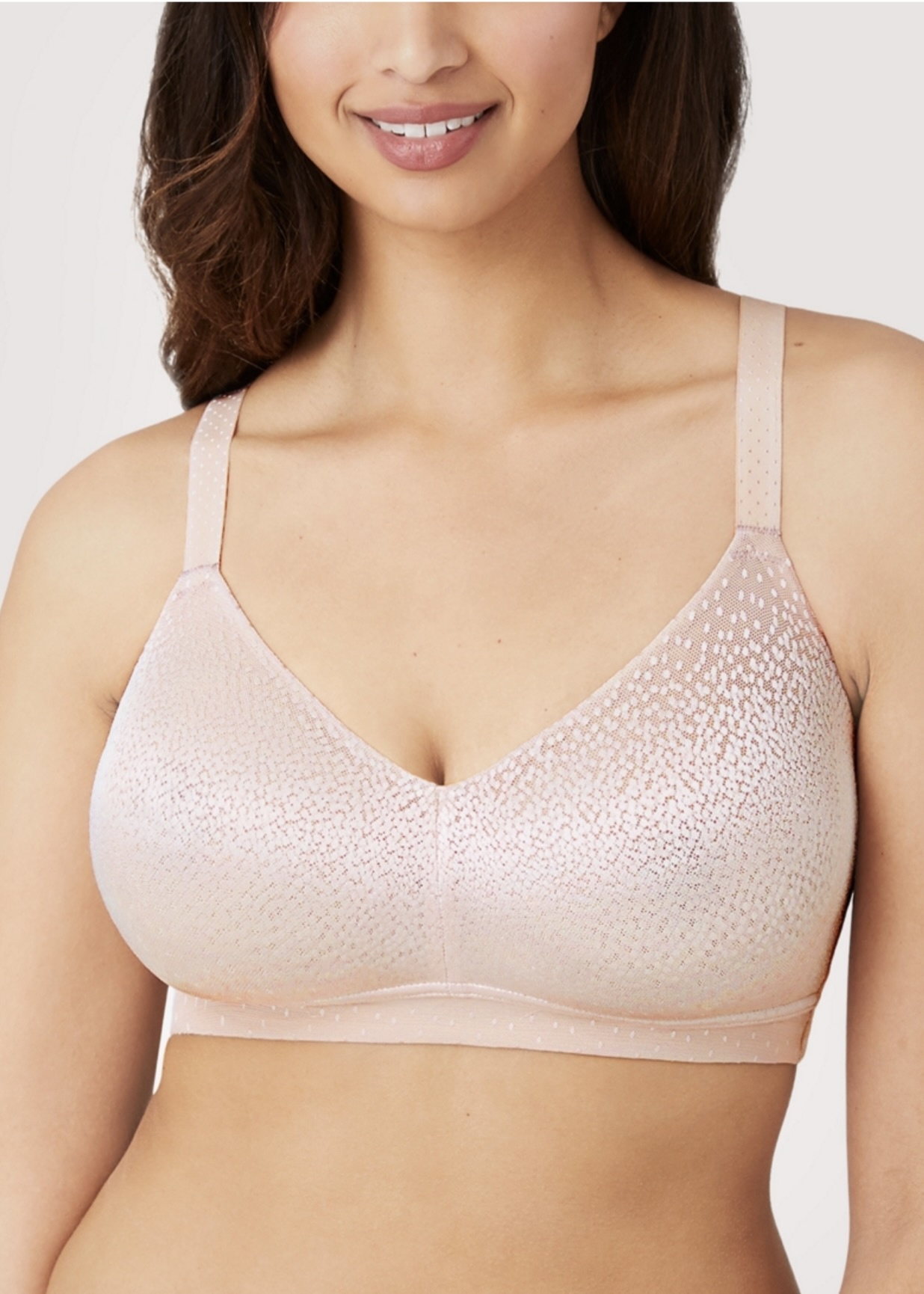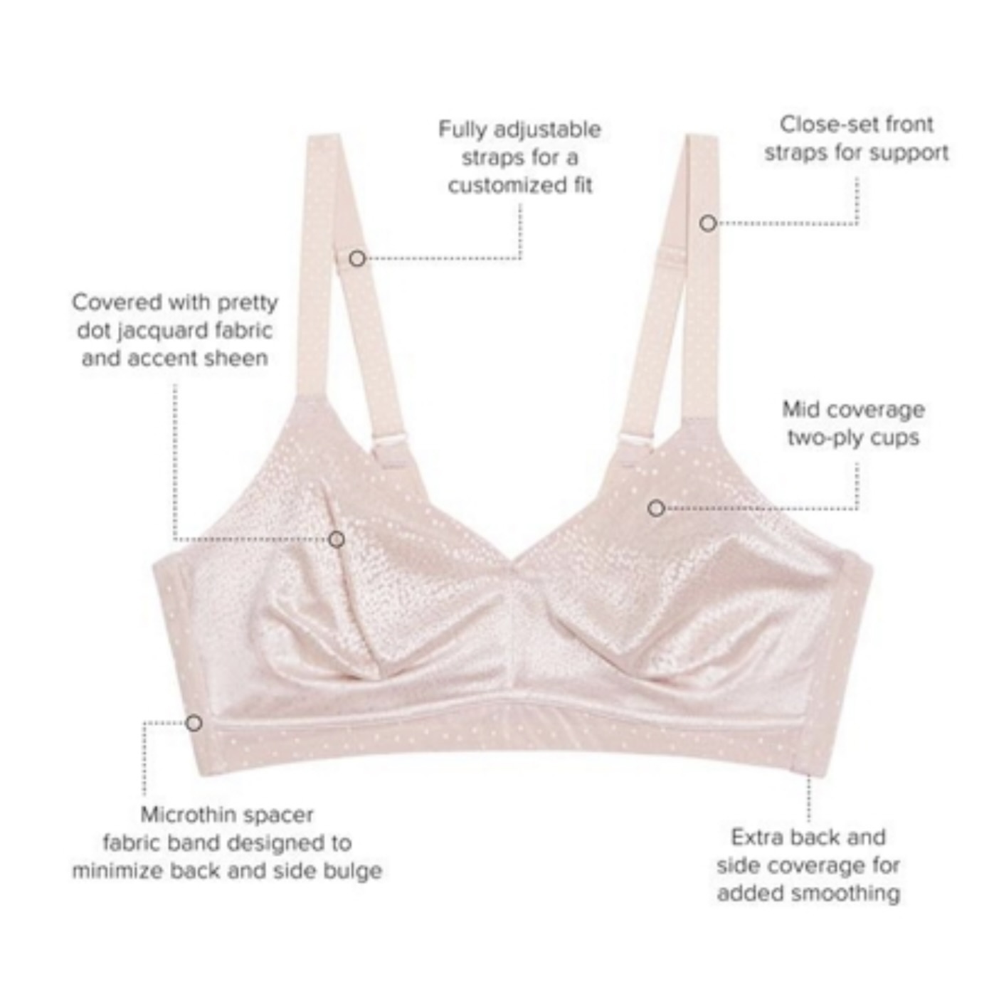 - Micro thin spacer fabric band designed to minimize back and side bulge concealed with pretty dot jacquard fabric