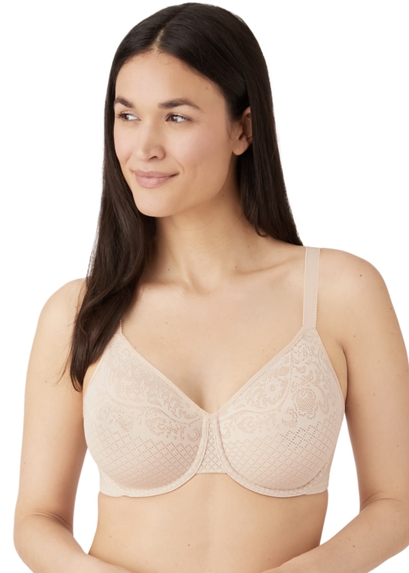 - Full coverage seamless lace cups with sheer mesh lining