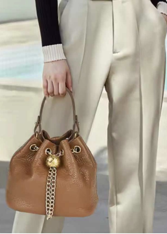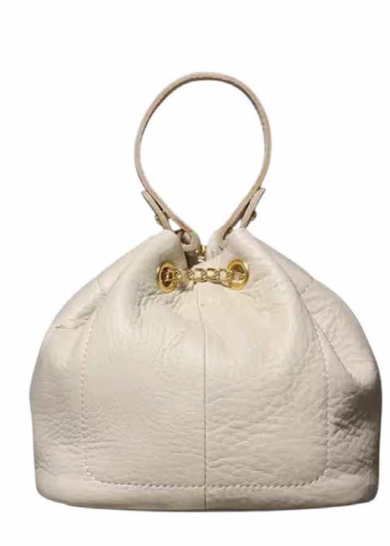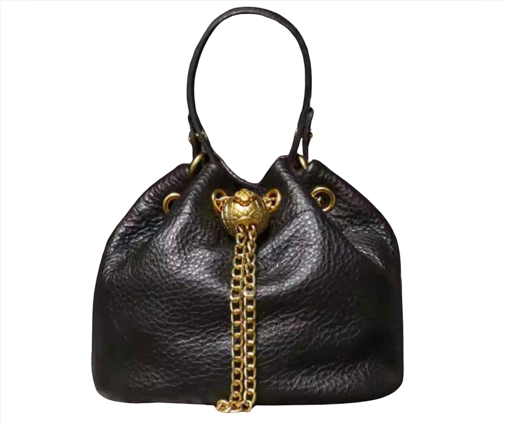 Minimalist drawstring leather with beautiful gold long chain. Perfect during the day or fabulous enough for evening.